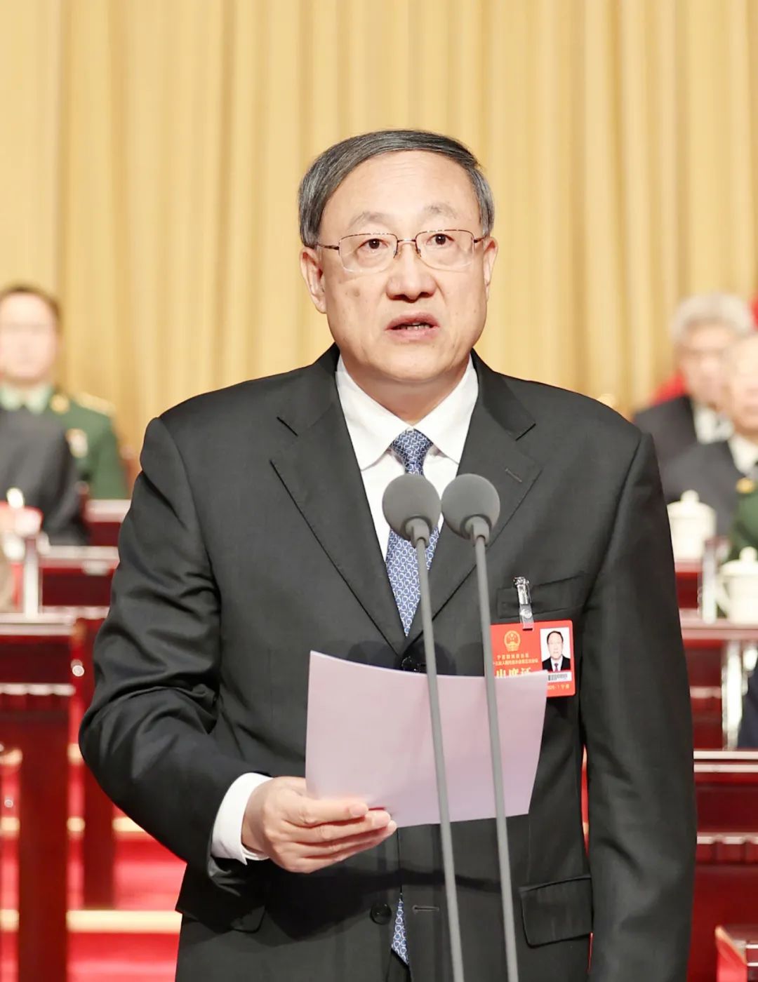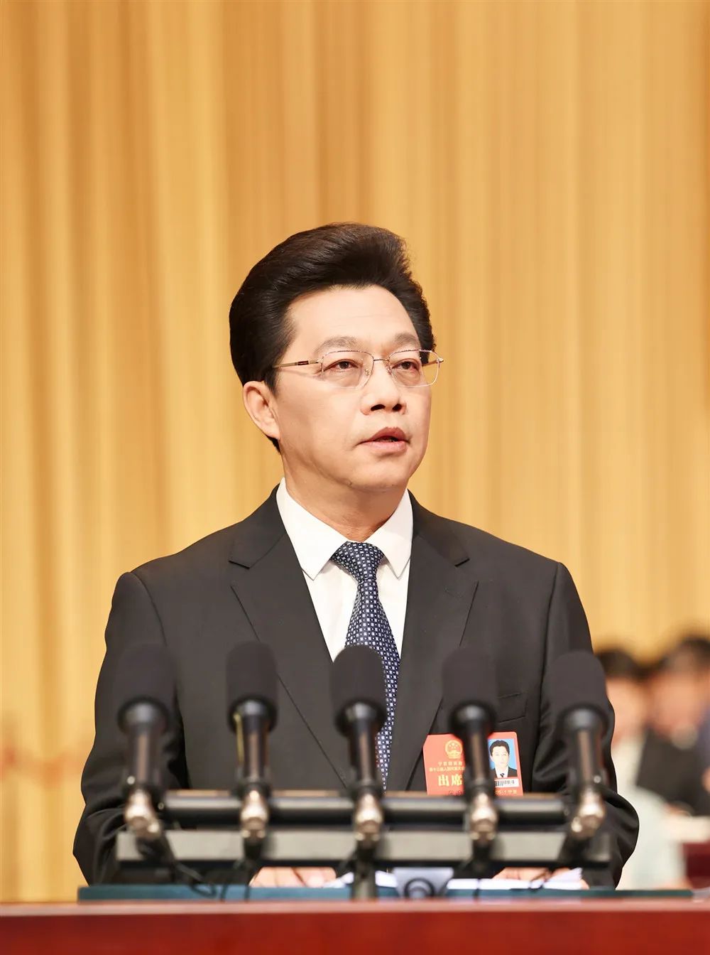 宁夏人民会堂气氛庄重热烈。主席台帷幕正中的国徽在鲜艳的红旗映衬下熠熠生辉;二楼眺台悬挂着“坚持以习近平新时代中国特色社会主义思想为指导,始终牢记总书记重要嘱托,解放思想、守正创新,精耕细作、团结奋斗,加快建设美丽新宁夏、奋力谱写中国式现代化宁夏篇章!”的标语,振奋人心、催人奋进。