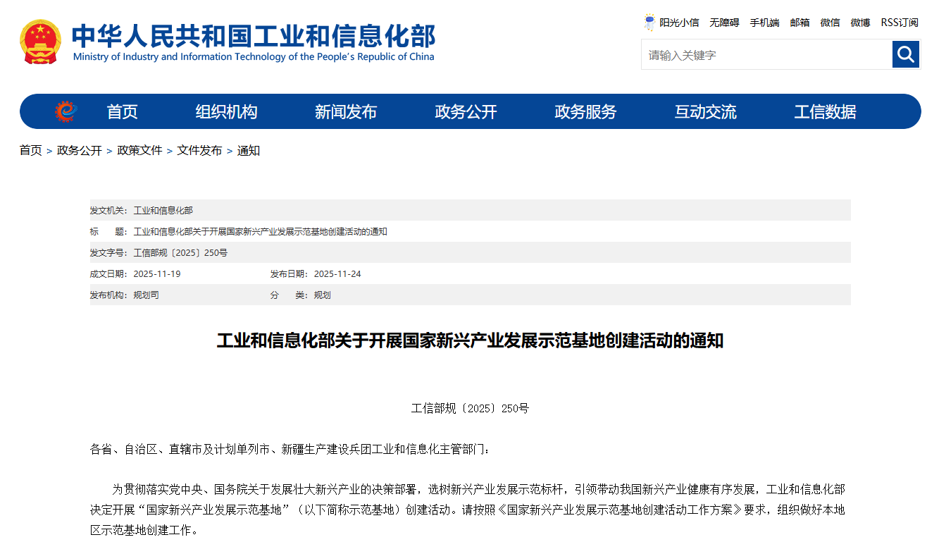 为贯彻落实党中央、国务院关于发展壮大新兴产业的决策部署,选树新兴产业发展示范标杆,引领带动我国新兴产业健康有序发展,工业和信息化部决定开展“国家新兴产业发展示范基地”(以下简称示范基地)创建活动。请按照《国家新兴产业发展示范基地创建活动工作方案》要求,组织做好本地区示范基地创建工作。