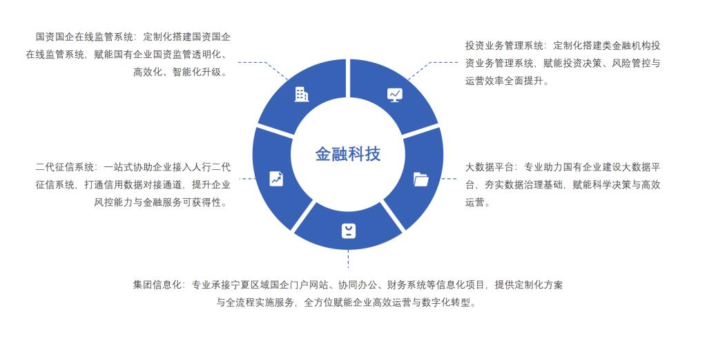 业务覆盖国资监管、企业信息化建设、征信对接、大数据平台搭建等核心领域,为国有企业、类金融机构等客户提供定制化服务。涵盖门户网站、协同办公、财务系统等信息化项目开发,人行二代征信系统接入支持,以及智能风控、数据治理、合规监管等专项服务。